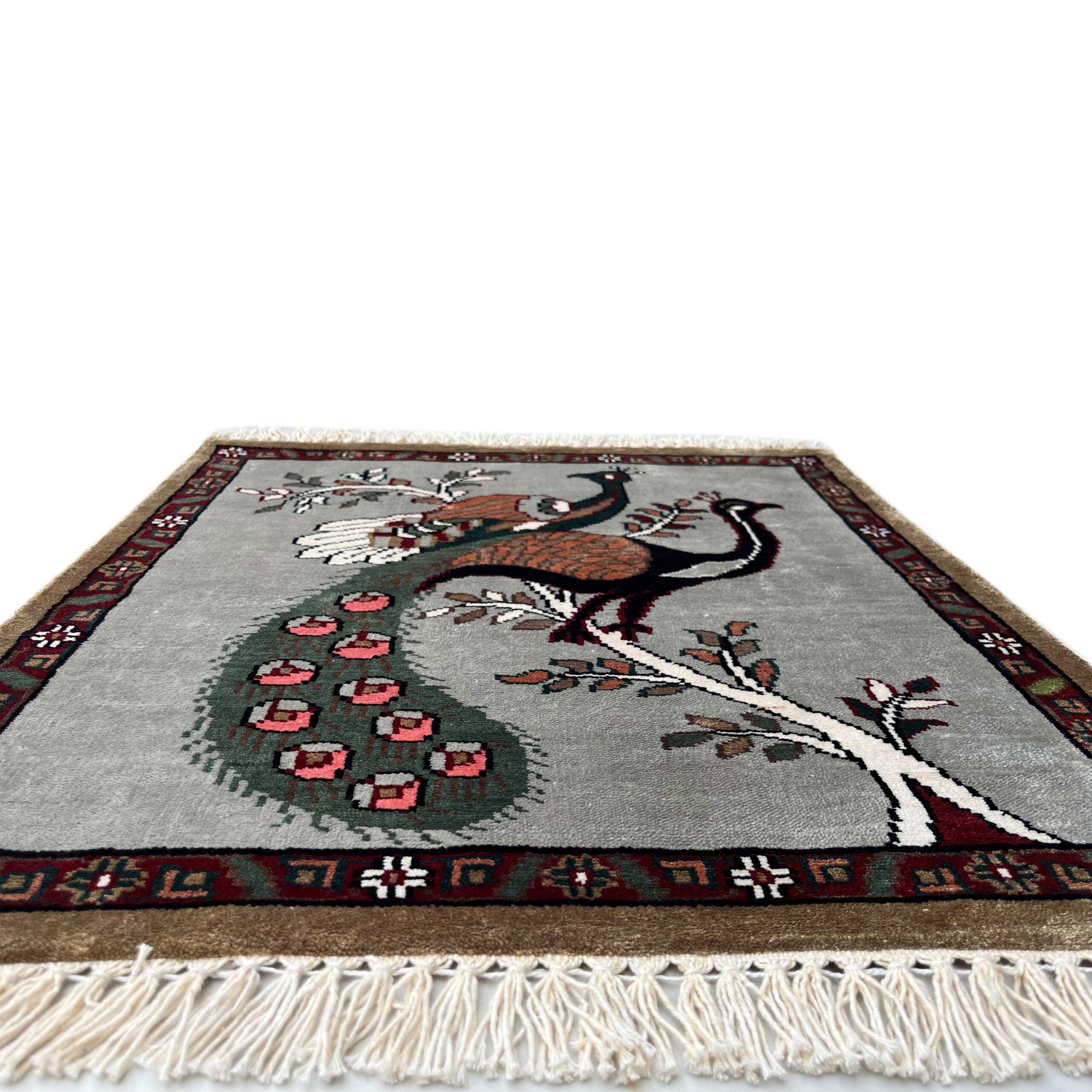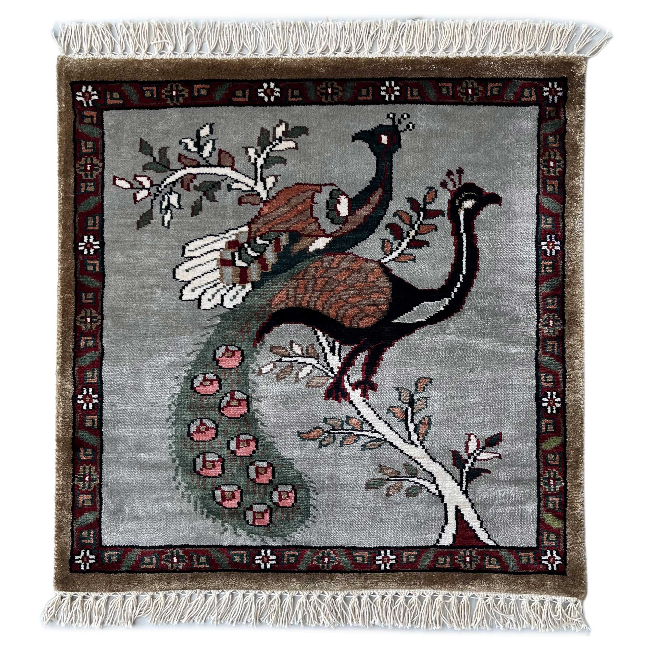 This 2×2 feet Handmade Rug Peacock and Peahen Gray is carefully hand knotted by skilled artisans using fine materials. The design reflects traditional craftsmanship blended with modern aesthetics, making it ideal for living rooms, bedrooms, entryways, or offices. Durable, soft, and elegant, this rug adds warmth and character to any interior.