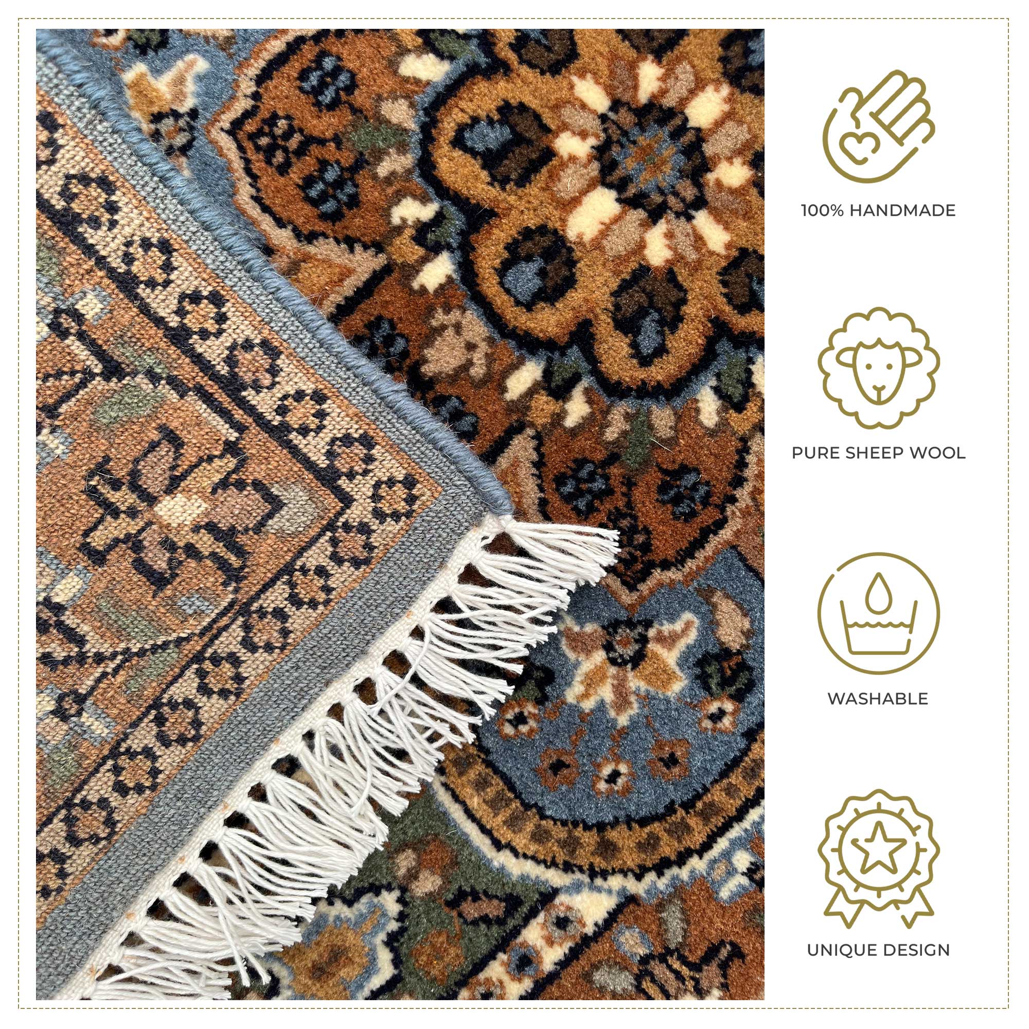 • Each rug is made with passion, intricacy, and fine detailing—making it unique and long-lasting.